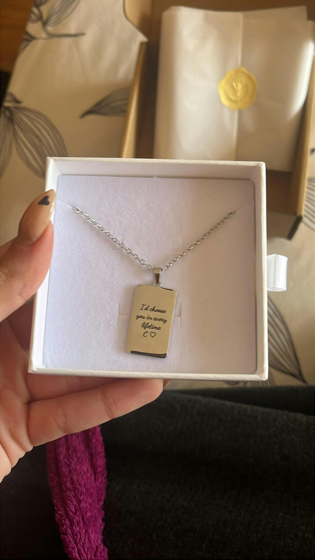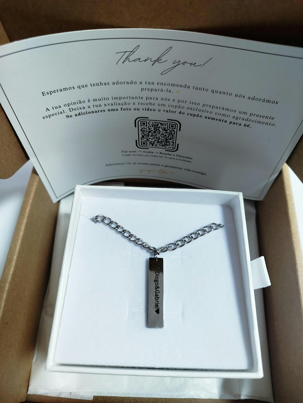 Incrivelmente bonito e tal como imaginei. A frase gravada super perceptível. A qualidade dos pendentes e do fio são espectaculares. Farei mais encomendas sem dúvida .